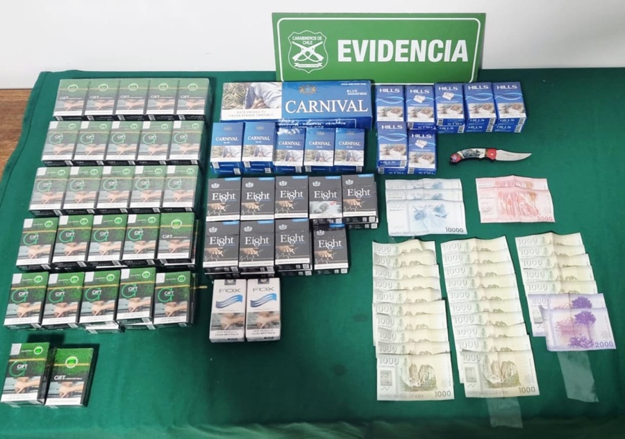 Luego fue fiscalizada la mujer a quien se le encontró en su poder 102 cajetillas de cigarrillos que no se comercializan en Chile, un cortaplumas y una hoja de acero afilada.