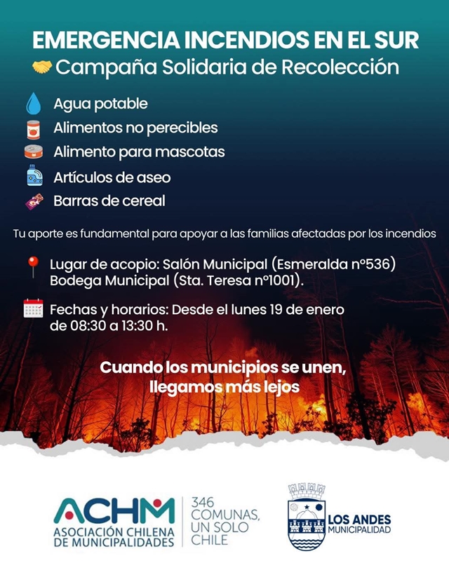 LOS ANDES (19/01/2026).- Desde este lunes los municipios de la Provincia de Los Andes realizan campañas solidarias con el propósito de acudir en ayuda de las familias que han resultado damnificadas por los incendios forestales en las regiones de Ñuble y Biobío, formulando un llamado a los vecinos a colaborar y efectuar sus aportes de acuerdo a lo que se está solicitando.