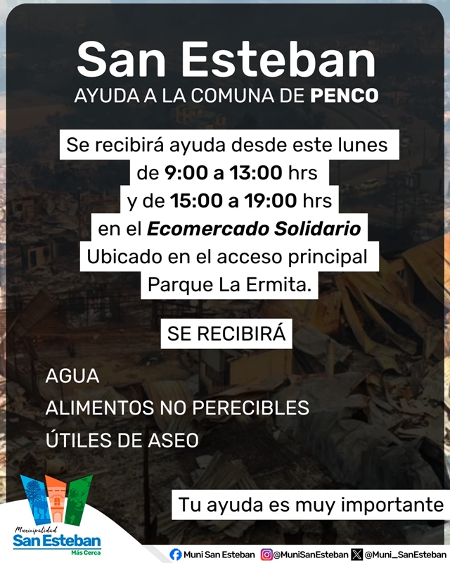 Por su parte, la Municipalidad de San Esteban informó que se apoyará a las familias de la comuna de Penco, iniciativa que busca reunir artículos de primera necesidad.