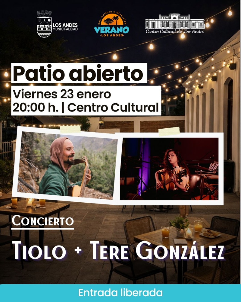 La música continuará el viernes 23 de enero en el Centro Cultural de Los Andes, donde a las 20:00 horas se presentarán los músicos aconcagüinos Tiolo y Tere González. El concierto incluirá composiciones propias y un repertorio diverso, en un ambiente que también ofrecerá un patio cultural con café y otras propuestas para disfrutar la tarde.