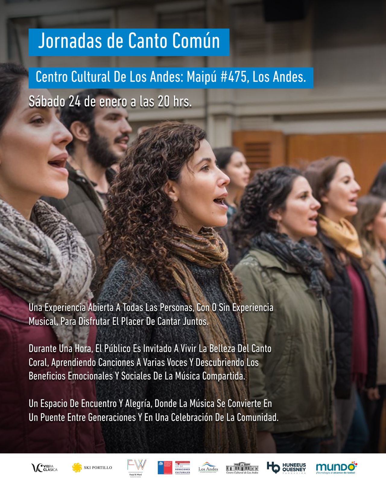 Finalmente, el sábado 24 de enero, se realizará el cierre del Portillo Fest con una especial jornada de canto común, una experiencia participativa de canto lírico abierta a toda la comunidad. La actividad se desarrollará a las 20:00 horas en el Centro Cultural de Los Andes y busca acercar al público a la música desde una vivencia colectiva.