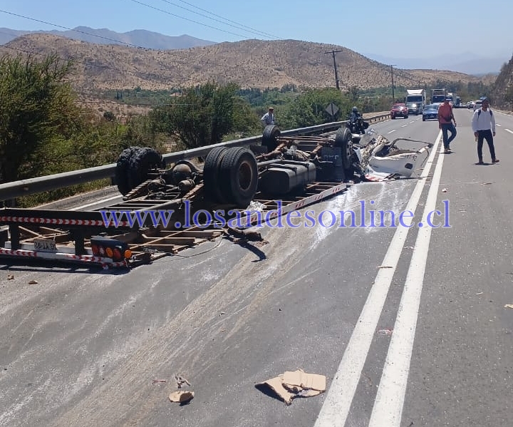 De acuerdo a los antecedentes preliminares obtenidos por Los Andes Online, el accidente se registró pasadas las 14:10 horas a la altura del kilómetro 55, cuando un camión ¾ cargado con artículos de aseo que hacía ingreso al valle de Aconcagua perdió el control y se fue hacia un costado chocando contra la ladera del cerro.